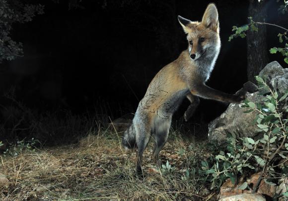Fotografía de un JABALÍ (Sus escrofa), ha colonizado todo tipo de terrenos desde los boscosos hasta las zonas de monte más claro desplanzándose a veces a grandes distancias por la noche en busca de alimento en los cultivos en los que suele causar a veces grandes destrozos y volviendo por las noches a las zonas de encame en los más profundo del monte, no desprecia la carroña o cualquier animal vivo que se ponga a su alcance