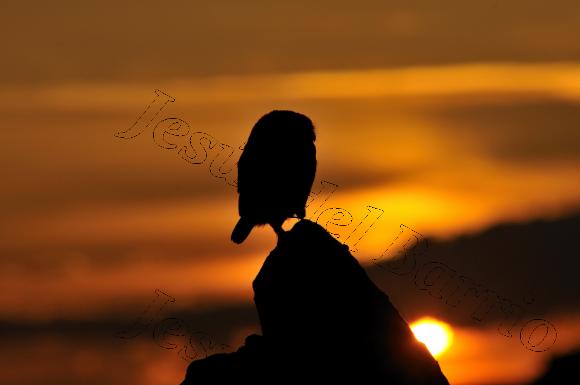 Fotografía de un atardecer con un Mochuelo Europeo posado sobre una roca en primer término