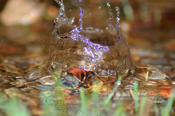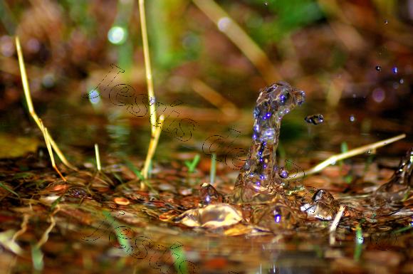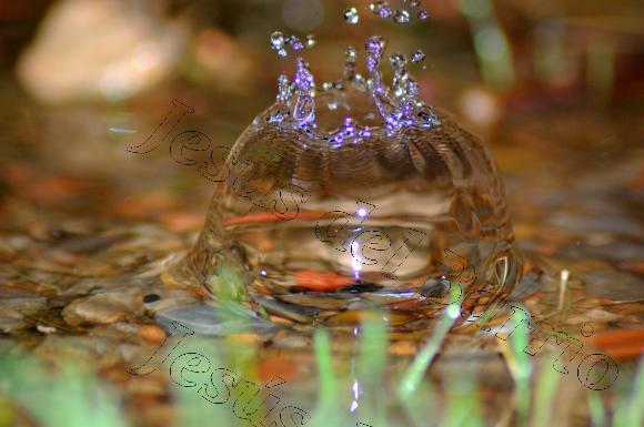 Fotografía nocturna de una gota de agua impactando sobre un pequeño charco