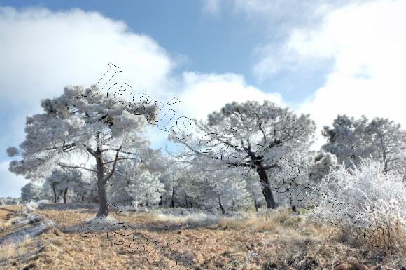 Pinos con una fuerte cencellada después de una noche de niebla y bajas temperaturas